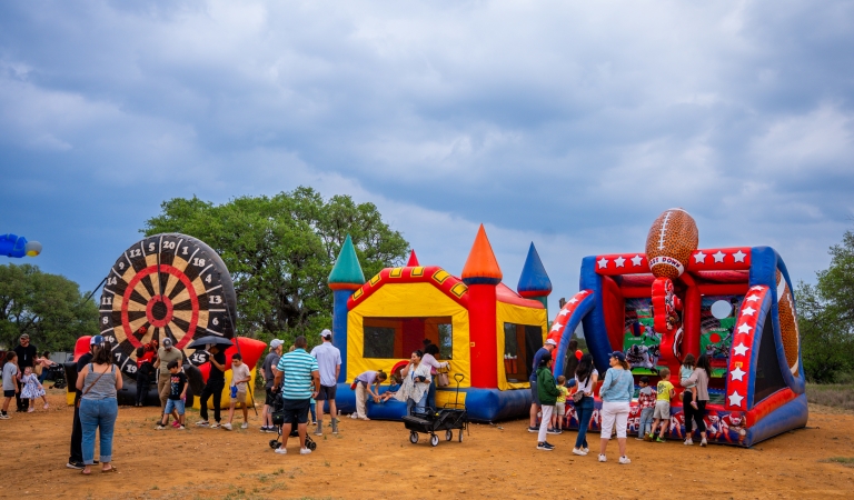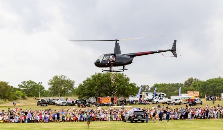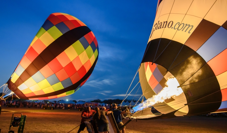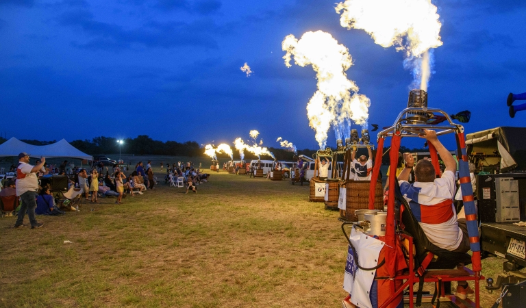 The evening also features live music by The Outsiders, colorful Giant American Kites soaring overhead, thrilling paramotor demonstrations, the high-energy Disc Dog Show, and an exciting skydiving performance. The highlight of the night is the Balloon Glow Finale, when the balloons illuminate the ranch in a dazzling display set against the beautiful backdrop of the Texas Hill Country.