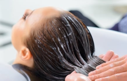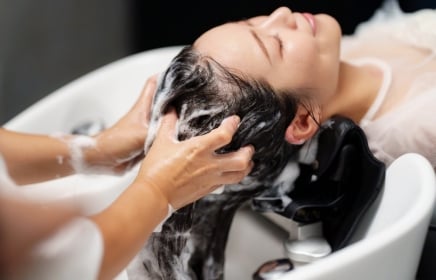 • A woman in a pink shirt getting her hair washed by a professional at the spa.