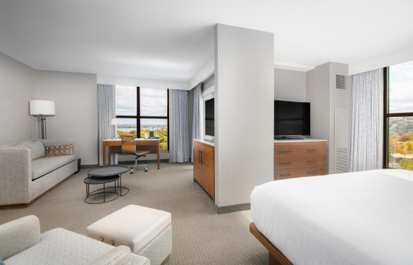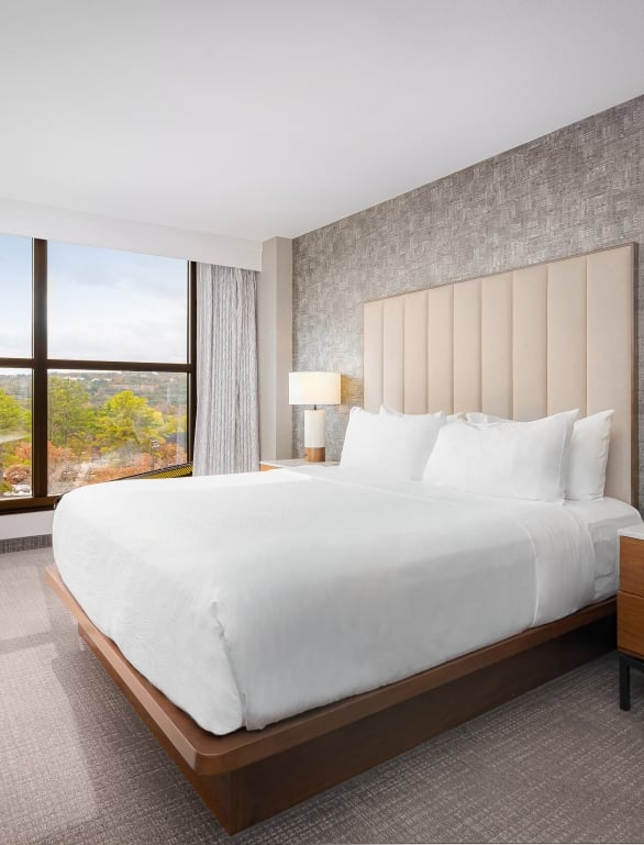 A spacious layout with two rooms, floor-to-ceiling windows and a balcony with views of either the hotel pool or Lake LBJ.