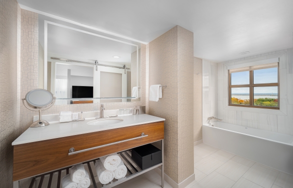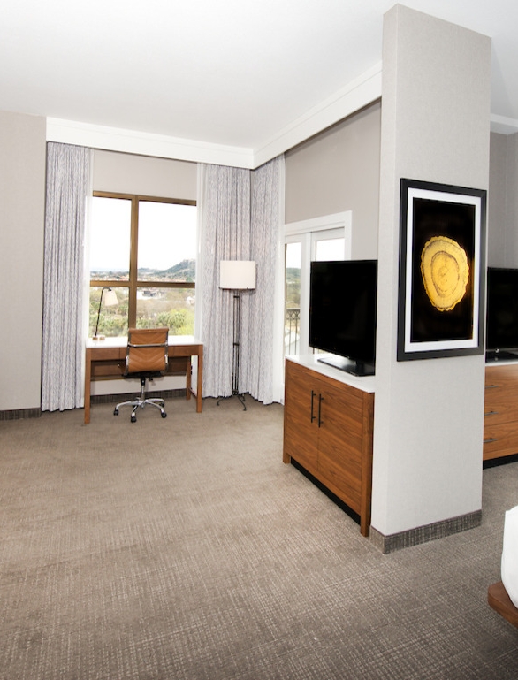 The one-room Executive Suite showcases the best of Texas Hill Country, with expansive views of Hill Country vistas along with Lake LBJ, best enjoyed from the furnished private balcony. Floor-to-ceiling windows allow for plenty of natural lighting, while the marble top desk offers inspiring views for those seeking to work while at the resort. An additional living space with warm colors welcomes all travelers to enjoy a relaxing retreat.