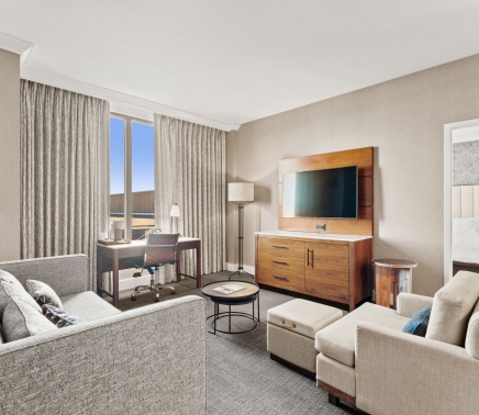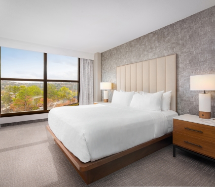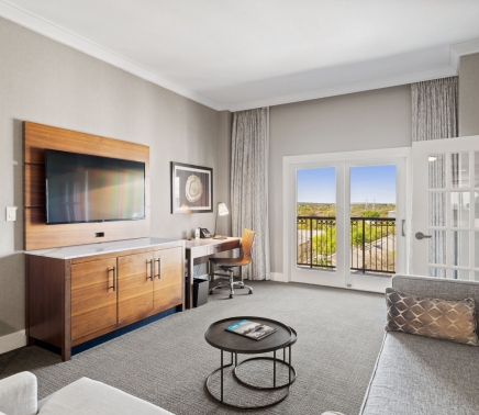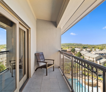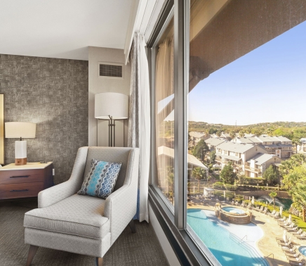 A spacious layout with two rooms, floor-to-ceiling windows and a balcony with views of either the hotel pool or Lake LBJ.