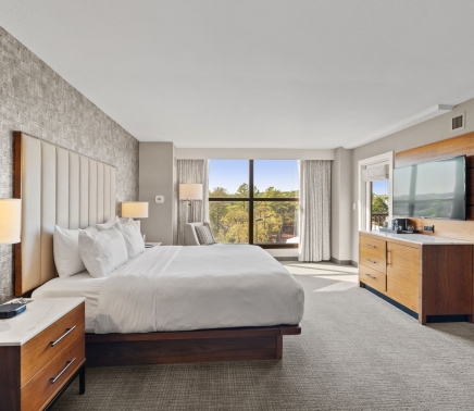 A spacious room with a king bed, a balcony and floor-to-ceiling windows with direct views of the hotel pool or Lake LBJ.