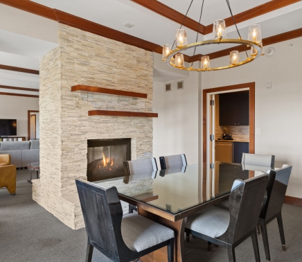 Our largest hotel suite with a kitchenette, dining table, stone fireplace and separate living space. Includes balcony off living room.