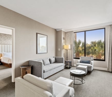 This three-bedroom suite includes two private connecting bedrooms with its own bathroom and a central living room with natural light perfect for large families.