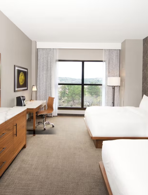 Take a break from the ordinary with this one-of-a-kind premium room in the Tower hotel. It features large floor-to-ceiling windows, allowing natural light to fill the room while also offering sweeping views of Lake LBJ and surrounding Texas Hill Country. This beautiful natural setting paired with tasteful furniture and two comfortable queen beds set the scene for a relaxing escape.