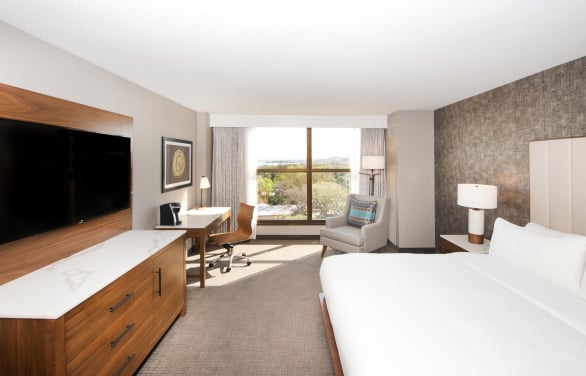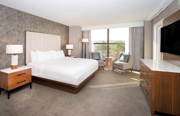 A spacious room with a king bed, a balcony and floor-to-ceiling windows with direct views of the hotel pool or Lake LBJ.
