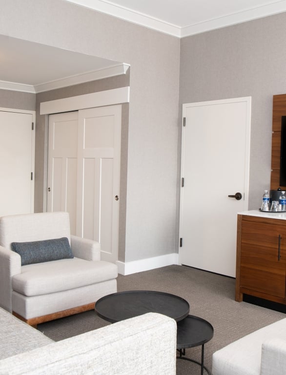 This three-bedroom suite includes two private connecting bedrooms with its own bathroom and a central living room with natural light perfect for large families.