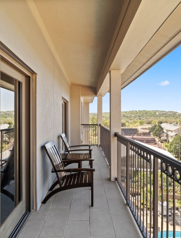 A one-room suite with an additional living space and expansive views of Lake LBJ, best enjoyed from the furnished private balcony.