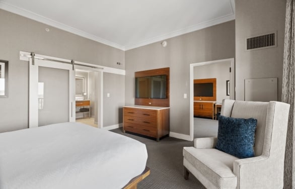 A two-room suite featuring a private bedroom with king bed, two large flat TVs and an additional living room with sofa bed.