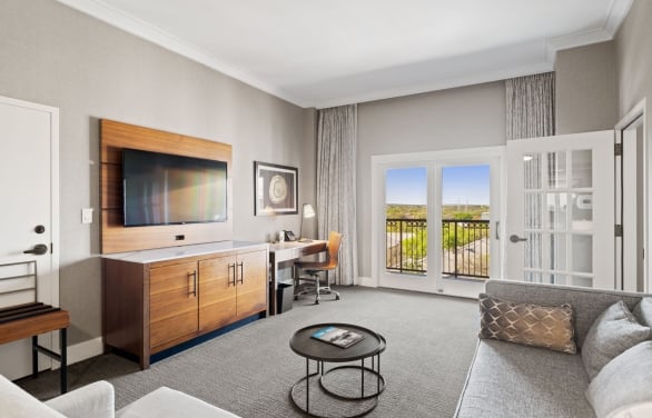 This captivating two-room suite is a plush accommodation, featuring an additional living space with comfortable furniture and a separate bedroom. The spacious layout and floor-to-ceiling windows allow natural light to fill this suite and create a comfortable escape in Texas Hill Country. Each Magnolia Suite features a balcony with views of either the hotel pool or Lake LBJ.