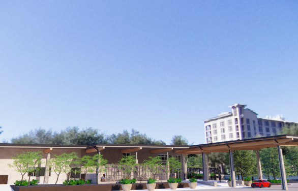 Our southwestern-style patio transforms from a tranquil daytime retreat into a sophisticated candlelit lounge setting at night. Featuring a built-in covered stage, tiered-steps and lush gardens that create a memorable outdoor setting for receptions and events.